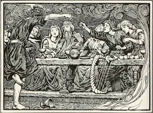 Leshópurinn rýnir í Lokasennu. Það er partí hjá Ægi en Loka var ekki boðið, svo Loki fríkar út og er með dólgslæti.