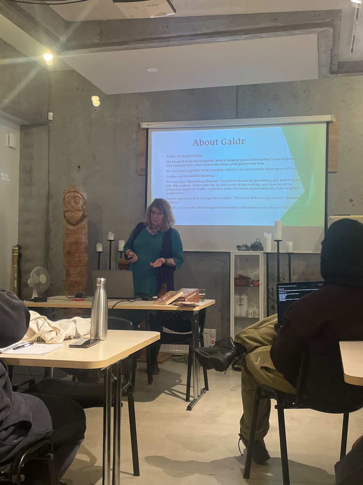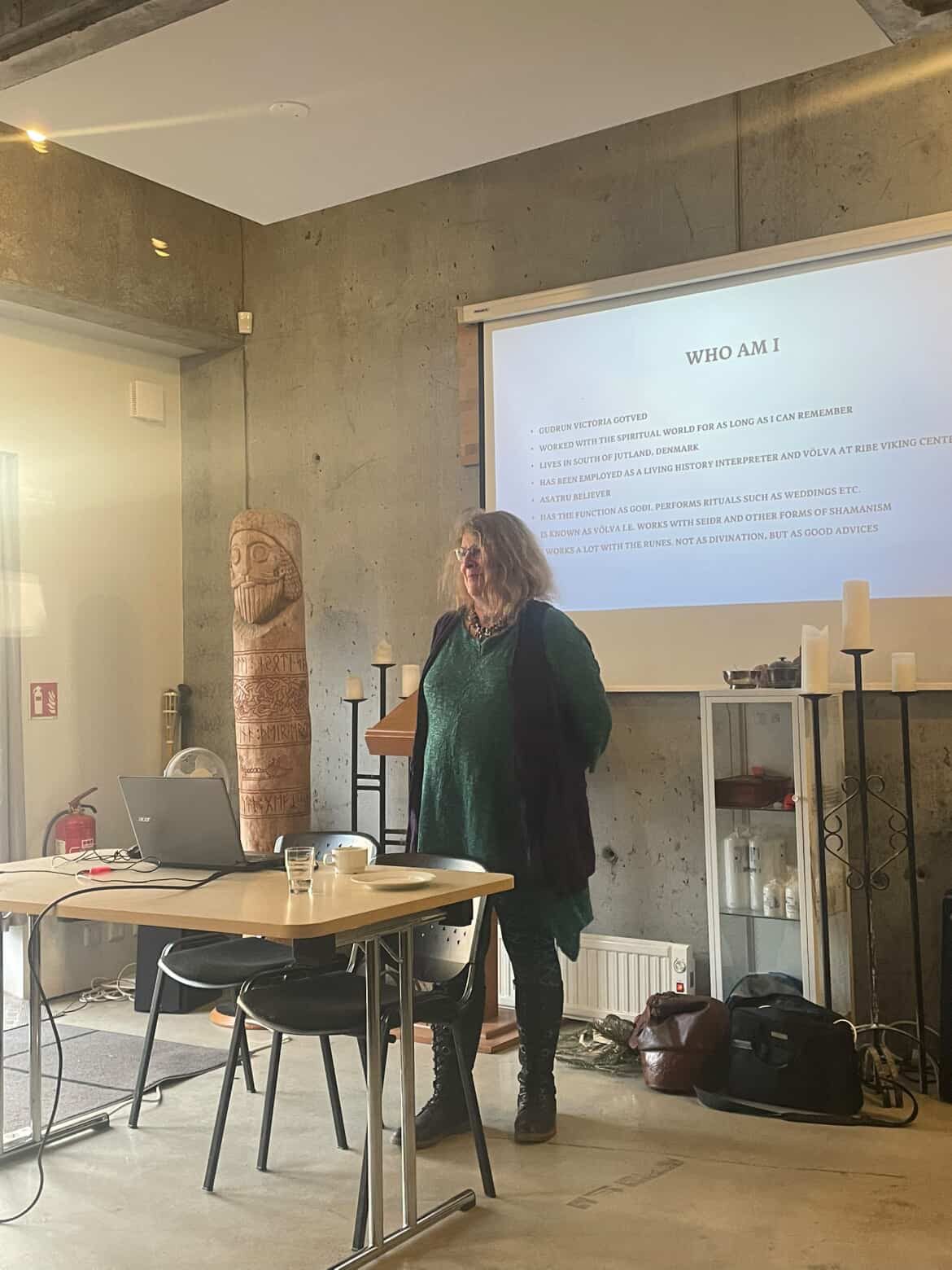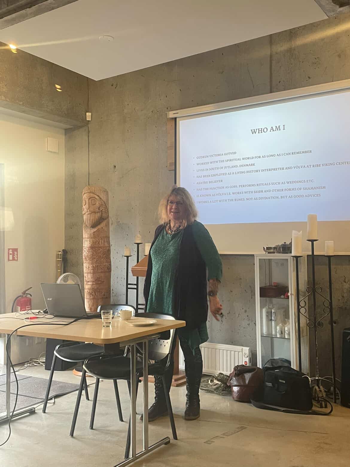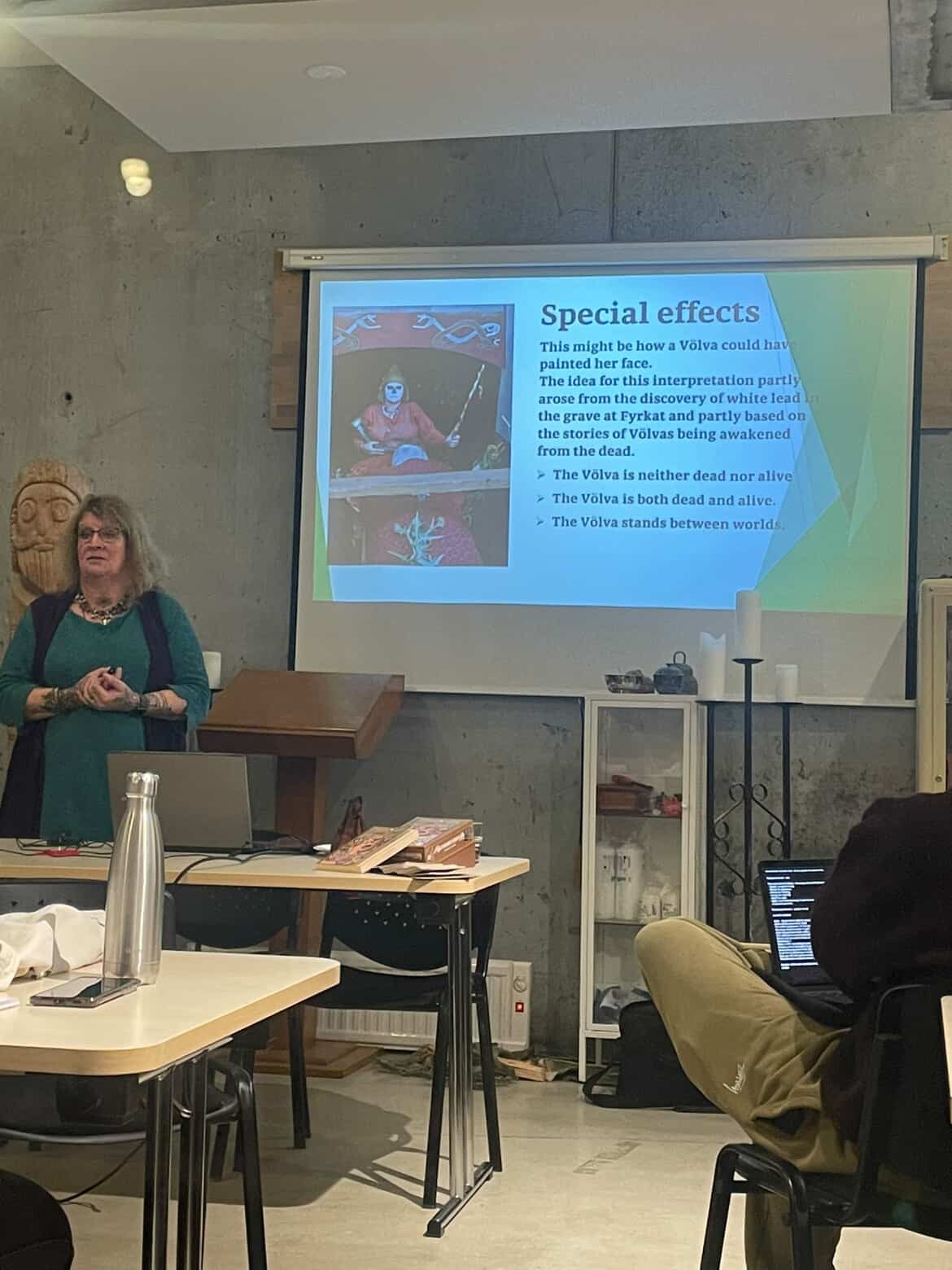 Á sunnudeginum hélt hún tvö erindi, annars vegar um danskar og íslenskar huldurverur og hins vegar um hlutverk völvunnar.