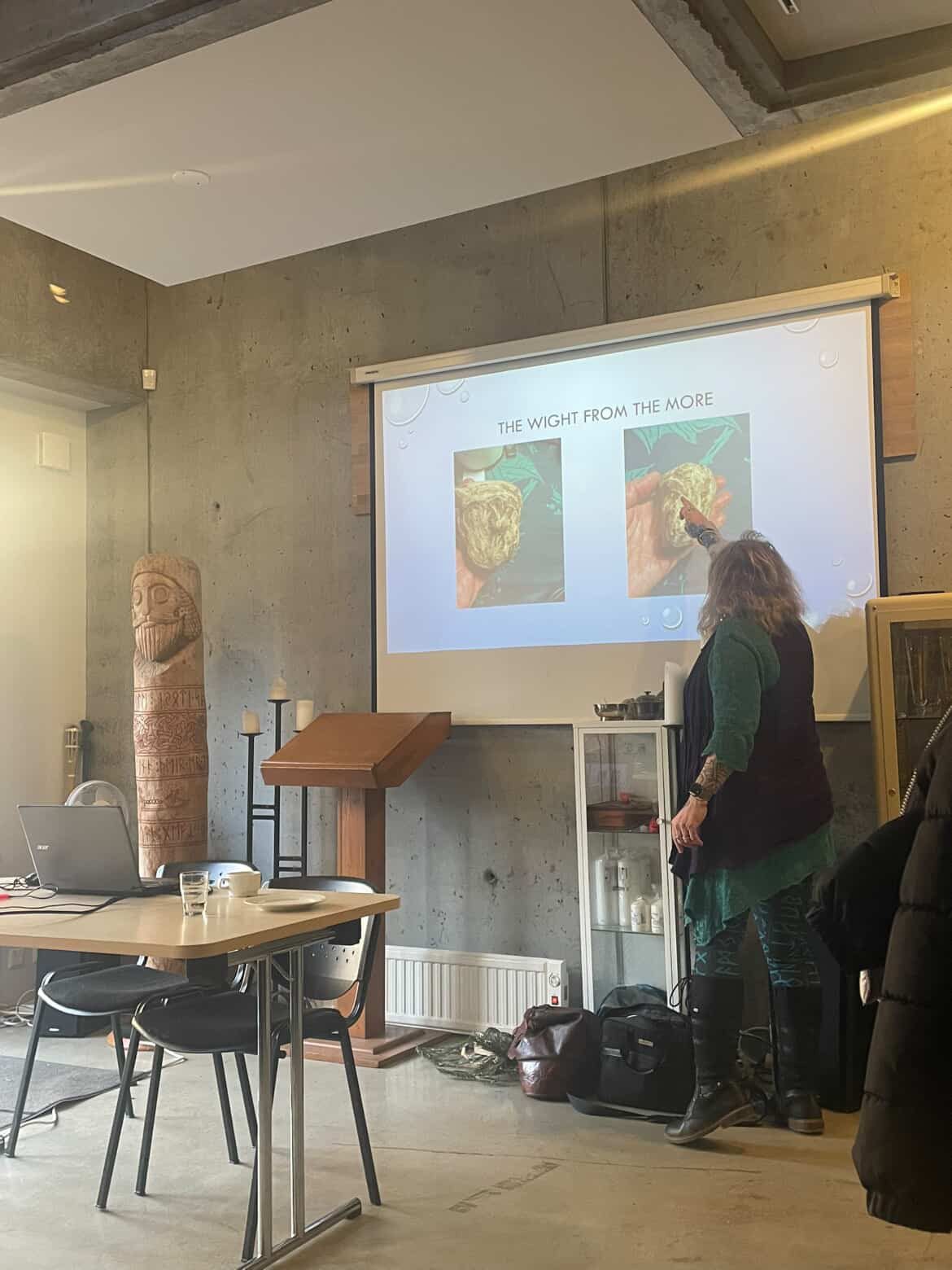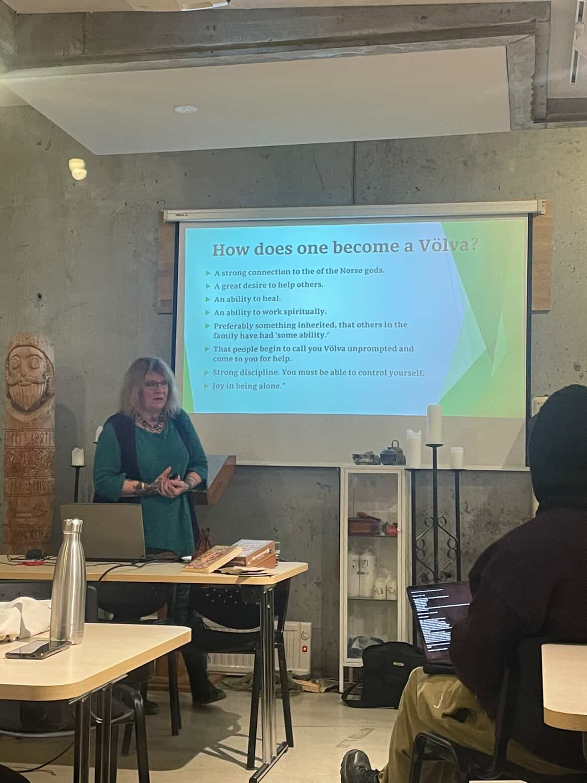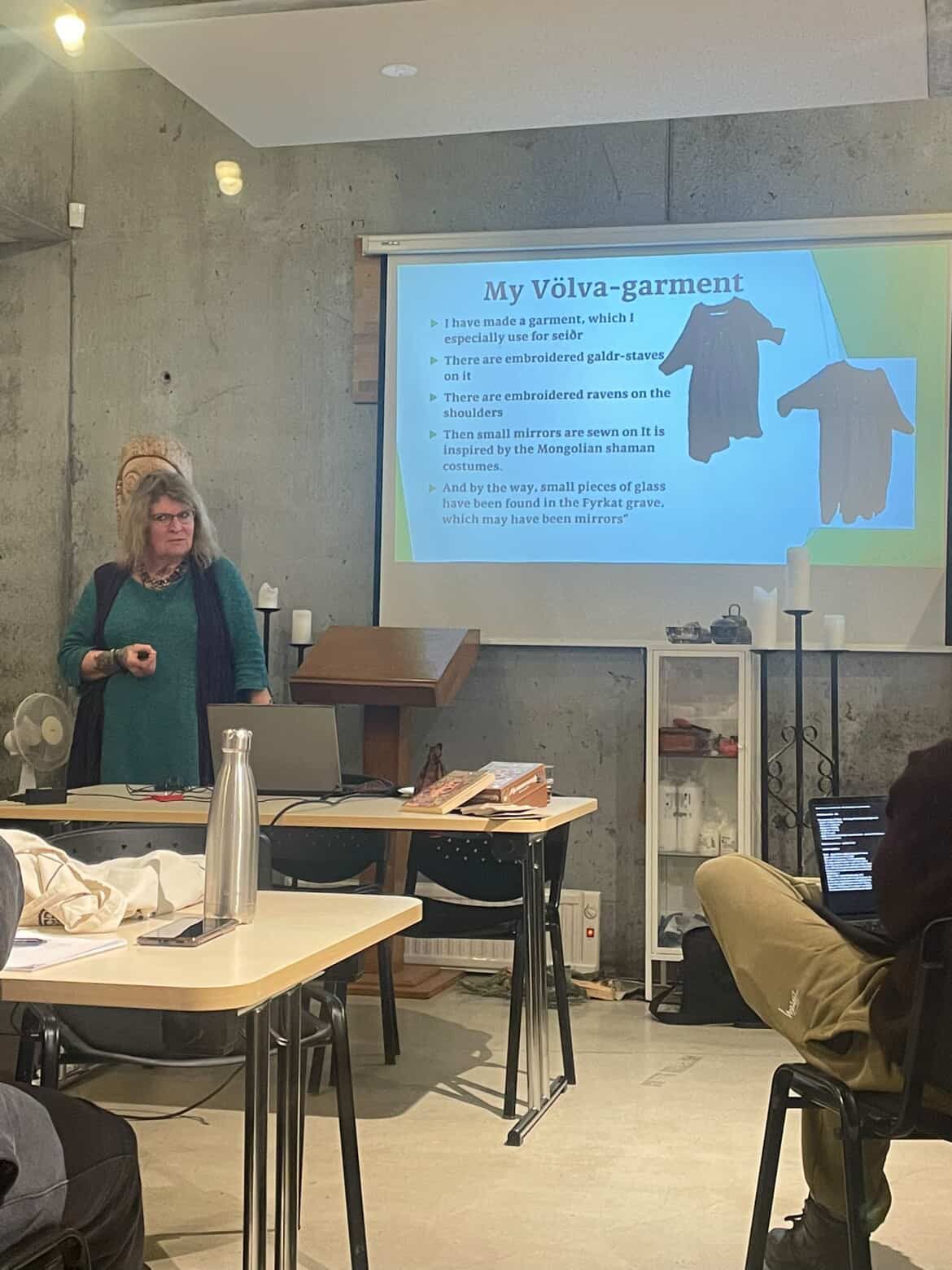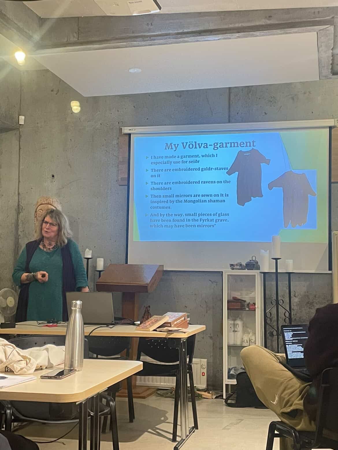 Á sunnudeginum hélt hún tvö erindi, annars vegar um danskar og íslenskar huldurverur og hins vegar um hlutverk völvunnar.